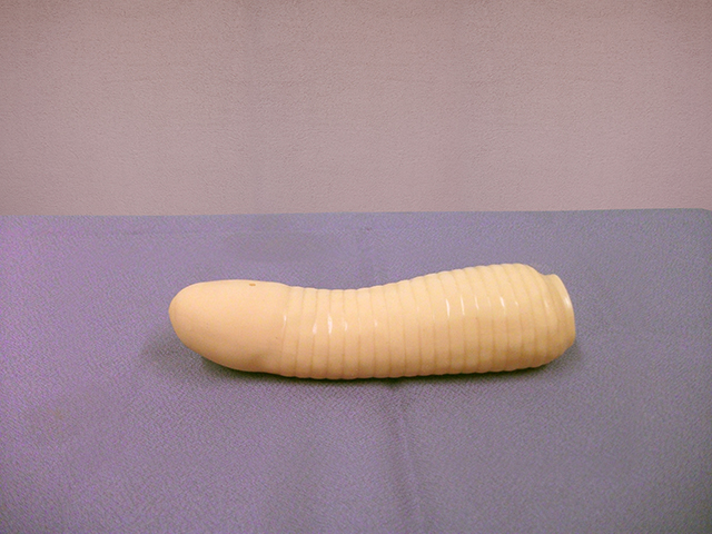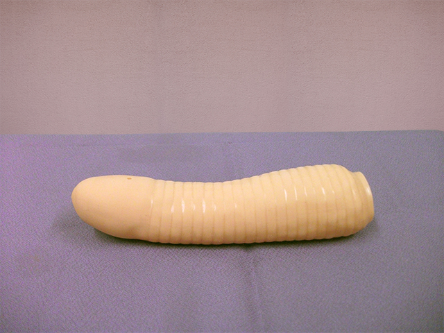 本器は 標準L16.5~17.5㎝、正常位で子宮口(ポルチオ)に接するが、 相手女性は一人ひとりその長さは違うので、 どうしても閊(つか)えるようであればカッターなどで手前の挿入口部分を切り取ってください。